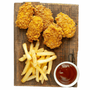 Parmak patates, kajun baharatı, sigara böreği, soğan halkası, sosis ve nugget ile.