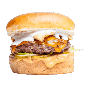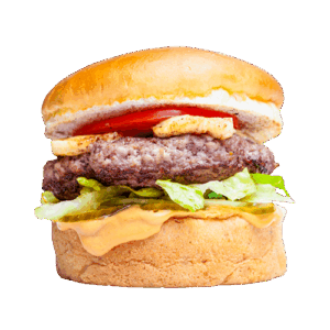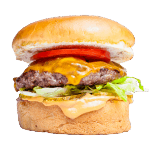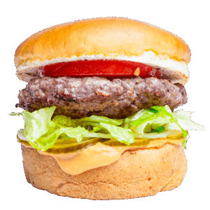 Hamburger köftesi (150gr), domates, göbek, turşu, burger sos ve dilim cheddar peyniri ile.