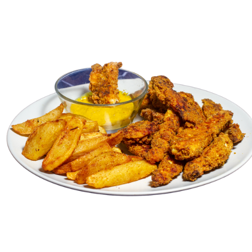 Paneli çıtır tavuk (150gr), parmak patates ve kajun baharatı ile.