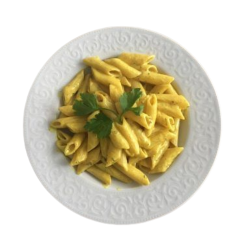 Penne makarna (230gr), jülyen tavuk (120gr), mantar, krema, pesto sos ve köri ile.