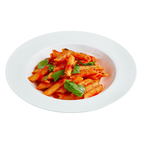 Penne makarna (230gr), napoliten sos, hot chili sos, dilim zeytin ve renk biber ile.