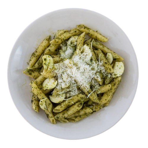 Penne makarna (230gr), jülyen tavuk (120gr), mantar, krema ve pesto sos ile.